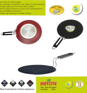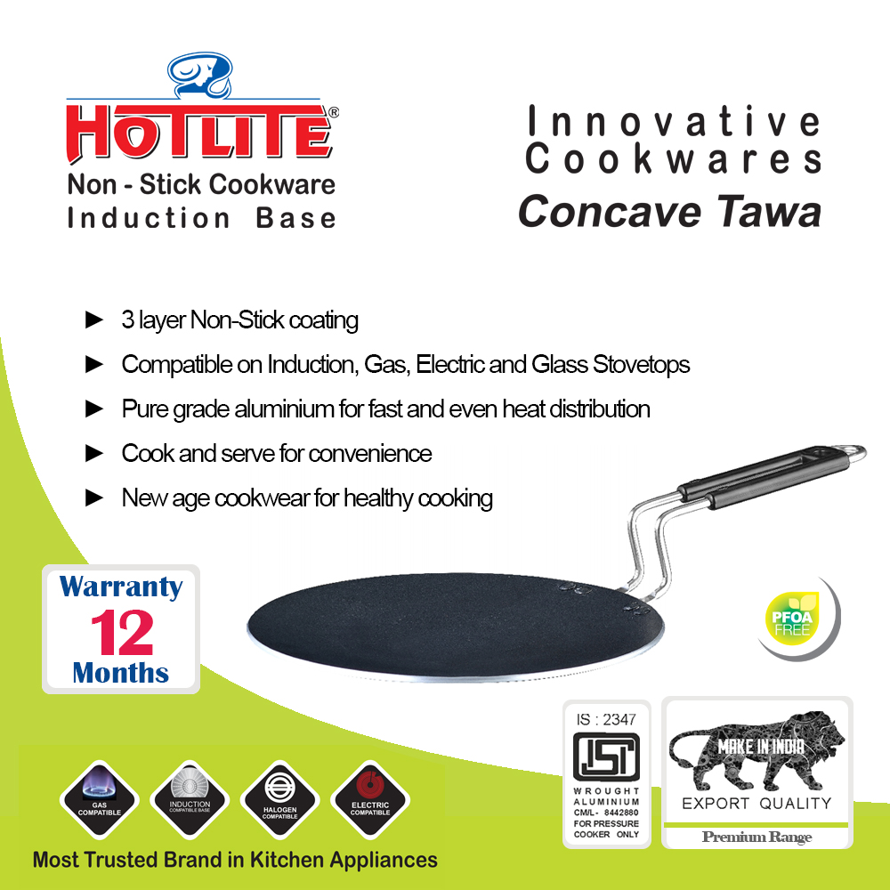 HOTLITE’s non-stick concave tawa, also known as a concave griddle, is a versatile kitchen utensil commonly used in Indian cooking. Its unique concave shape allows for even heating and oil retention, making it perfect for preparing a variety of dishes such as chapatis, rotis, and parathas. The non-stick coating ensures that the food doesn’t stick to the surface, making cooking and cleaning hassle-free. Its deep center also makes it suitable for cooking curries and gravies. Overall, the non-stick concave tawa is a must-have tool for any kitchen, especially for those who enjoy Indian cuisine. It is gas, Induction , halogen and electric compatible. comes with a warranty of 12 months.